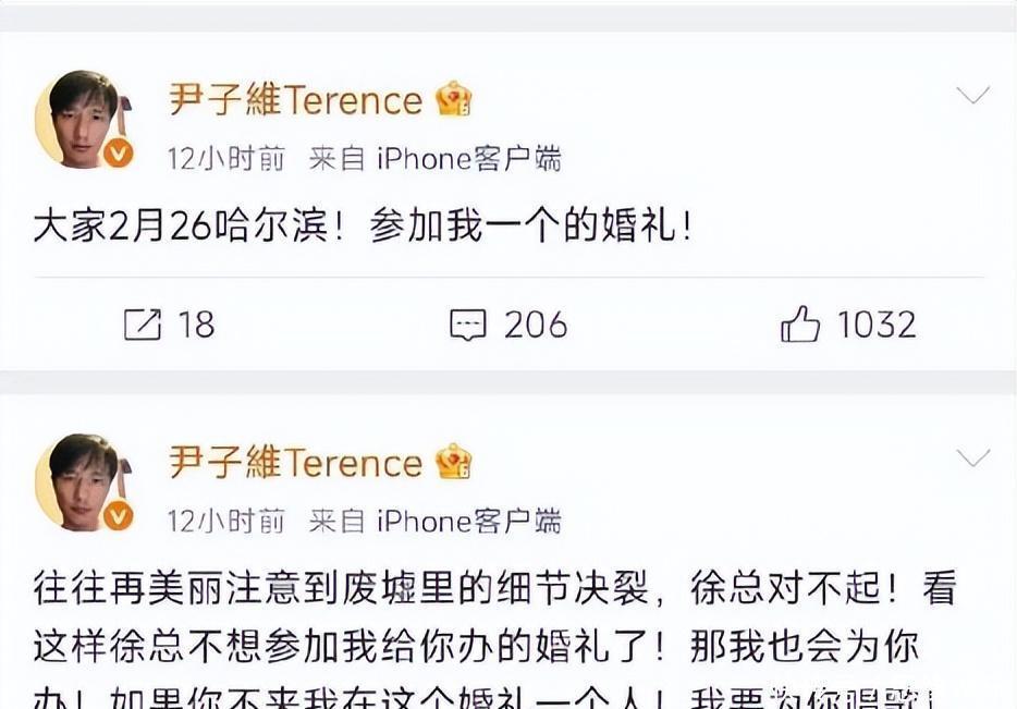 有人猜他俩是不是闹矛盾了,也有人觉得尹子维是太爱徐冬冬,都快为爱发疯了。后来网上还传尹子维家暴,徐冬冬赶紧出来回应,说根本没这回事,还找了律师要告造谣的人,态度特别坚决。 其实他俩这次闹别扭,就是因为婚礼在哪儿办没谈拢。徐冬冬想回哈尔滨老家办,尹子维觉得 2 月的哈尔滨太冷了,不适合办仪式,更想放杭州。后来尹子维发了那些文之后,俩人商量好了,哈尔滨先办,杭州再另外请朋友吃饭。不少网友还调侃,说尹子维这波赢了,靠网上的热度逼着徐冬冬松了口。